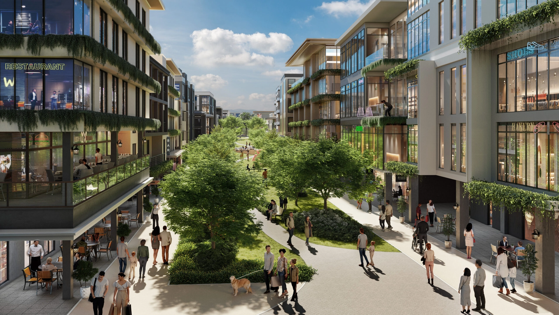 - Pedestrian-friendly district with green civic core